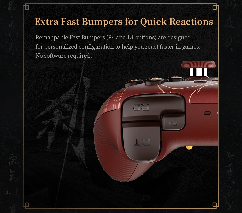 Equipado com sticks com sensor Hall GuliKit, o controle entrega precisão superior, reduzindo desgaste e garantindo movimentos suaves por muito mais tempo. Os gatilhos Hall-linear proporcionam respostas instantâneas, perfeitas para combates intensos e exploração detalhada, características marcantes do universo de Wuchang.